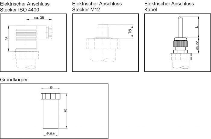 | Elektrischer Anschluss | Stecker ISO400 (ex DIN 43650) | Stecker M12x1, Kabel, weitere auf Anfrage |